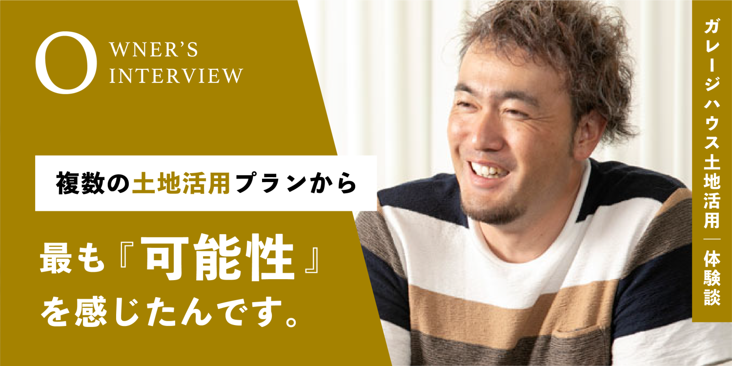 「“新しい土地活用に取り組みたい”という気持ちが大きかったので、普通のアパート・マンションとは一味も二味も違うガレージハウスを建てることができ、大変満足しています。実際の入居者さんは生活にゆとりがあり、かつ目新しいことを好む方が多いと聞きました。今後もっともっと注目されるであろう、賃貸ガレージハウスという土地活用の波にいち早く乗れたことは正解だったと自負しています。これからがますます楽しみです」