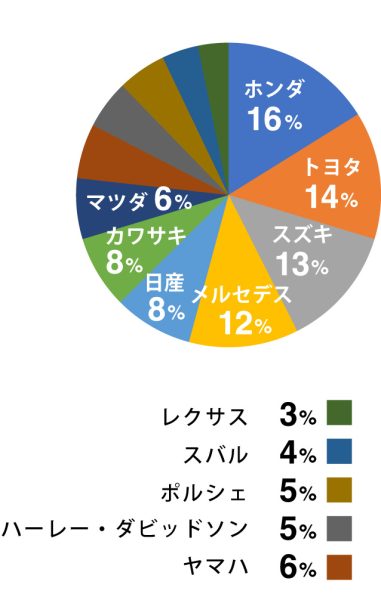 また、メーカーをみると、ホンダ、トヨタ、スズキと国産車がTOP3に。メルセデス・ベンツ、ポルシェ、スバル、レクサスなど輸入車・高級車やスポーツカーブランドの割合も高いことがわかります。