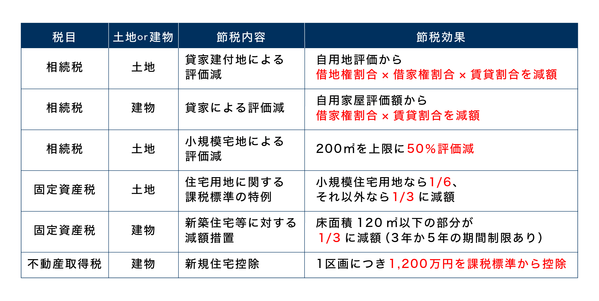 賃貸ガレージハウス経営、賃貸アパート・マンション経営など「土地の上に建物を建て、第三者に賃貸する土地活用」を行うことで節税できる税金の種類には、大きく「相続税」「固定資産税」「不動産取得税」があり、それぞれ適用されるための条件があります。それぞれの税金の内容と、節税のポイントについて紐解いてみましょう。