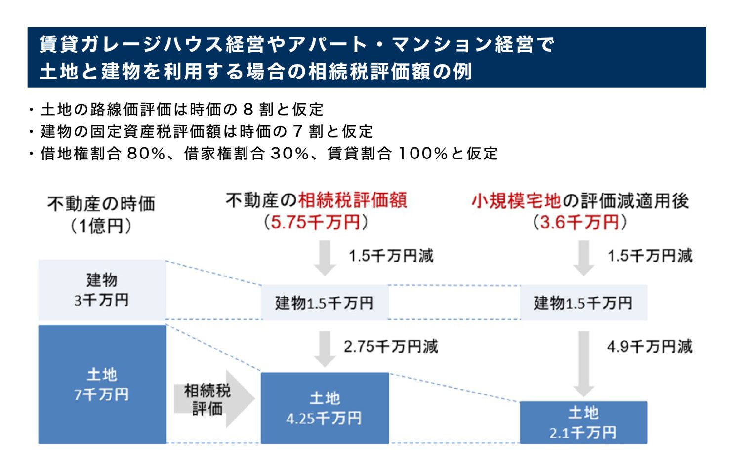 賃貸ガレージハウス経営やアパート・マンション経営などの住宅用不動産の場合、土地と建物の両方において固定資産税の優遇措置が適用されます。