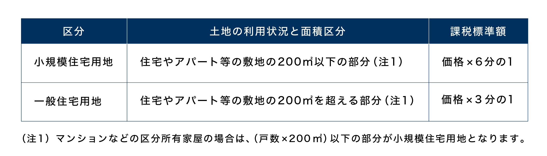 住居部分が1/2以上であれば建物用途が住宅扱いとなるため「住宅用地の軽減措置」が適用され、小規模住宅用地なら1/6、小規模住宅用地以外は1/3に減額。