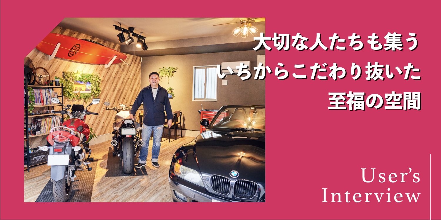 プレミアムガレージハウスに入居を決めた背景や、入居後の感想、お部屋づくりへのこだわりなどを伺う入居者様インタビュー。今回は、プレミアムガレージハウスで「大切な車とバイクに囲まれた暮らし」を叶えた建築士・石坂 覚さんのお宅を訪れました。