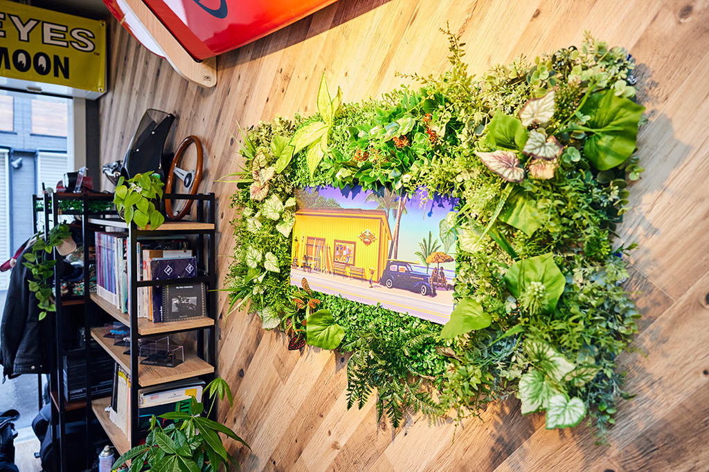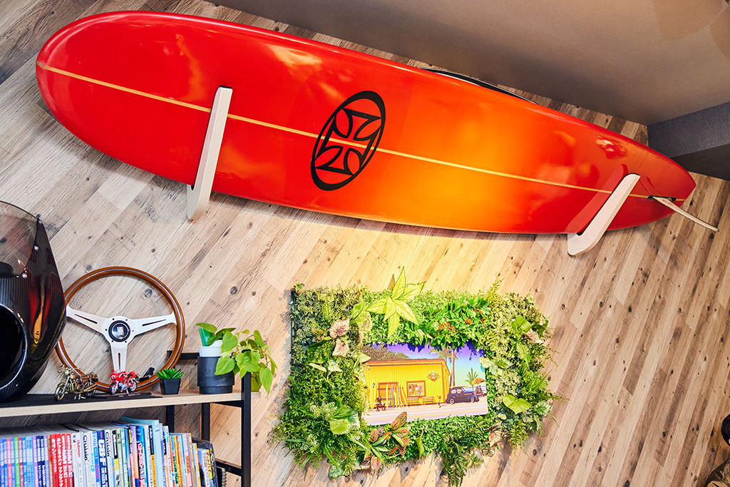 「プレミアムガレージハウスのガレージスペースは壁や床が素地のまま引き渡しされるので、内装をアレンジしやすいのが魅力です。向かって左側は、もともと趣味だったサーフボードを飾って、アクティブなアメリカンスタイルに。右側はスタイリッシュで落ち着いたヨーロピアンスタイルにして、ハイブリッドなインテリアに仕上げました。また、自然や植物を多用するバイオフィリックデザインも少し取り入れたいと思い、同僚に頼んで、壁の額縁に生木とフェイクグリーンをミックスして生けてもらいました。思い描いていたガレージがそのまま形になり、とても気に入っています。このガレージの中でバイクを磨いていると落ち着きますし、至福の空間ですね」