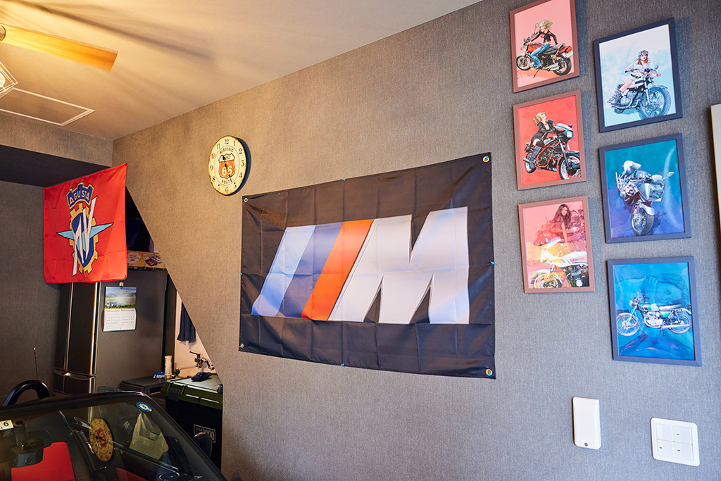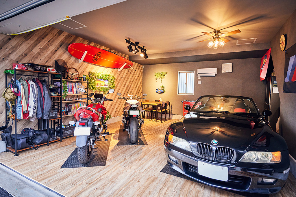 黒く眩い光を放つBMW Z3、その横にはKAWASAKIのスーパーネイキッドバイクZ1000が堂々と鎮座する、車・バイク好きにはたまらない光景が広がるガレージ。男の趣味空間を体現しながらも、壁面の装飾やインテリアの造り込みなどからは洗練された雰囲気が漂います。