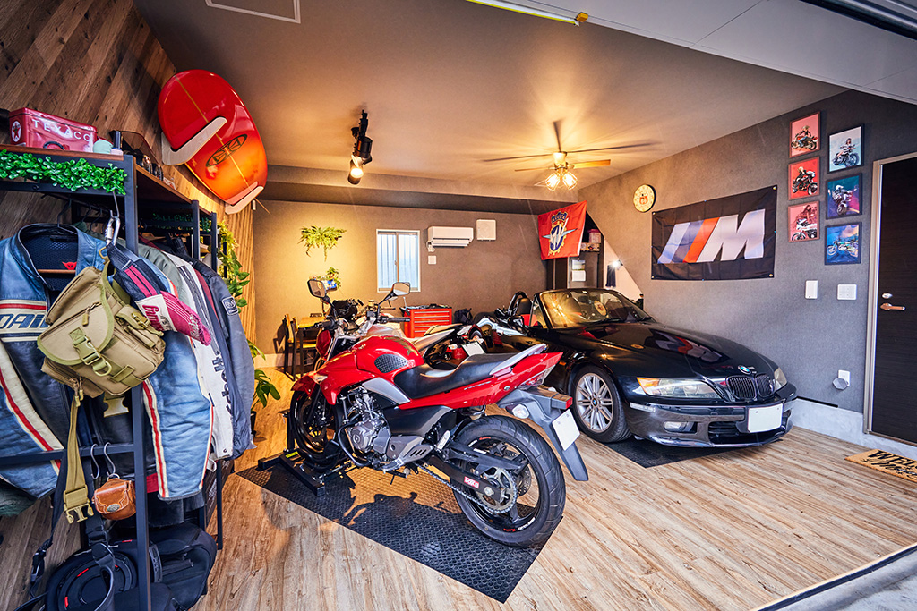 「夏の炎天下では作業ができないので、運動会で使うようなテントを張って整備していました。プレミアムガレージハウスでは、シャッターを閉めてエアコンを入れれば快適だし、天候も気にしなくていい。たとえば、ツーリングの誘いがあれば、前日の夜にチューニングや準備ができるなど、いつでも好きな時間に作業ができるのはすごくいいですね。ガレージが広く、奥行きもあるので余裕を持って作業できますし、開口部が大きいので車・バイクの出し入れがしやすいのも嬉しいです」
