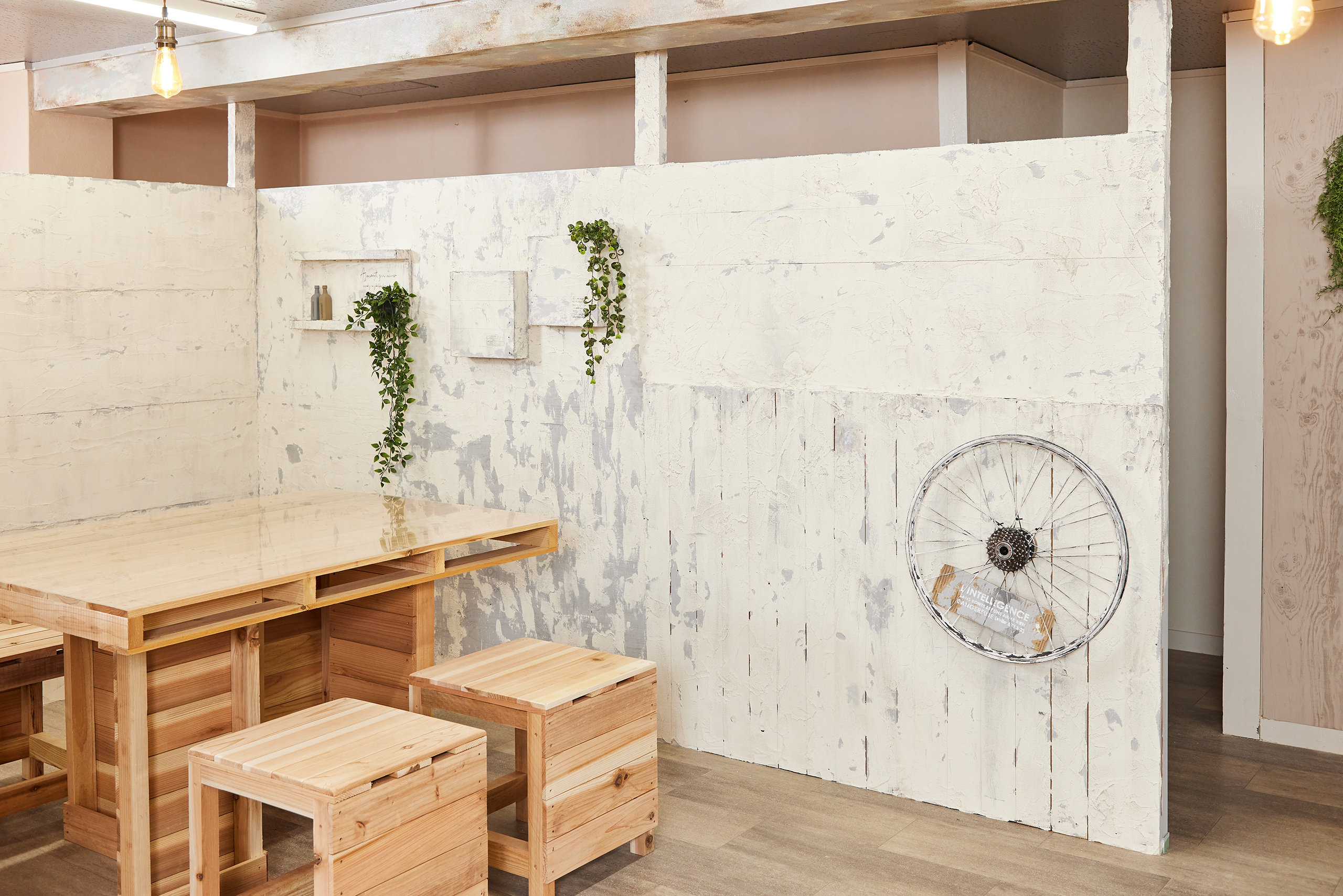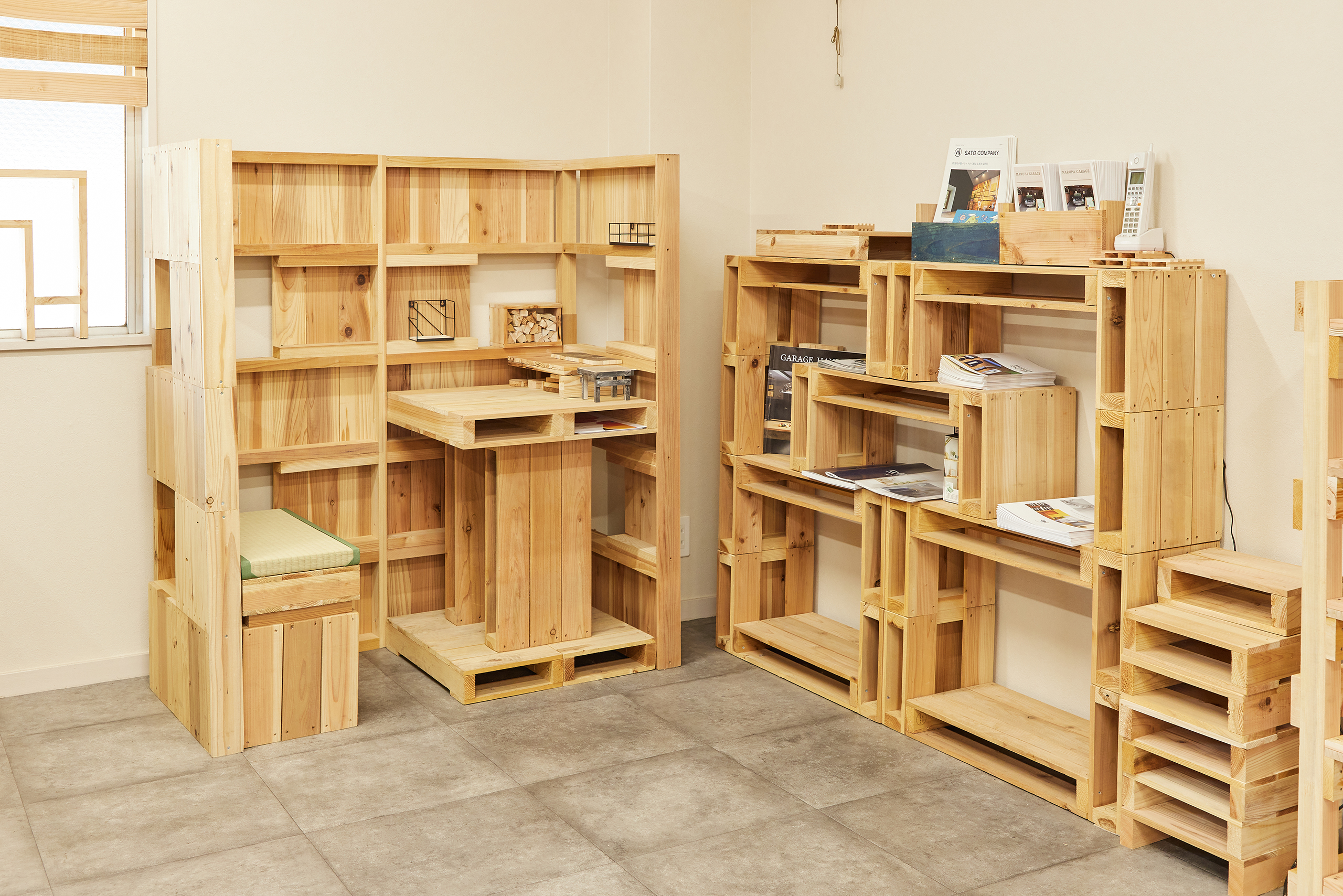 浦和工場2階のショールームへ行くと、パレットの形状や素材感を活かしたさまざまなDIYを見ることができます。