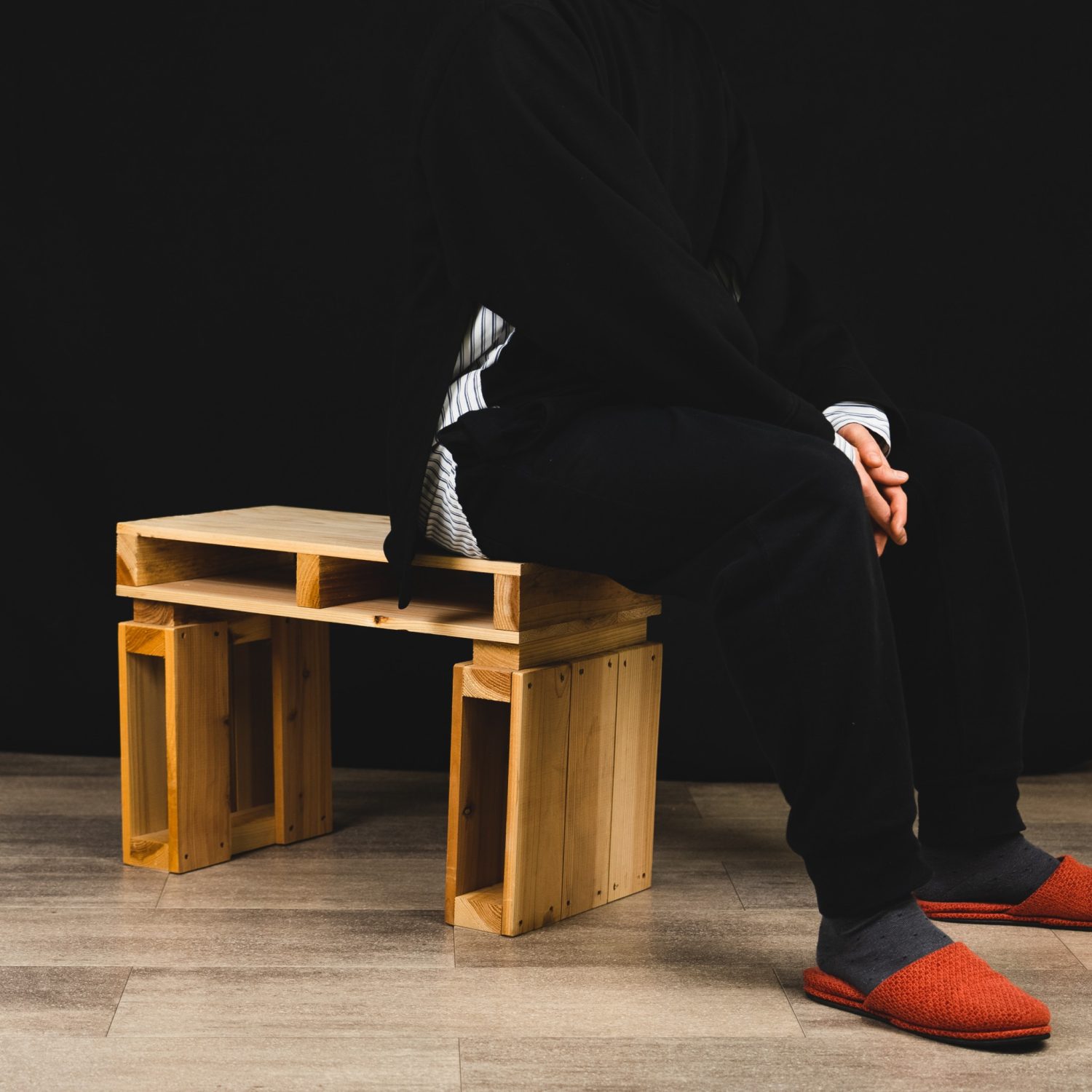 コンパクトながら丈夫なローベンチ。作業の休憩時間に、ちょっと腰を下ろしたくなるサイズ感です。