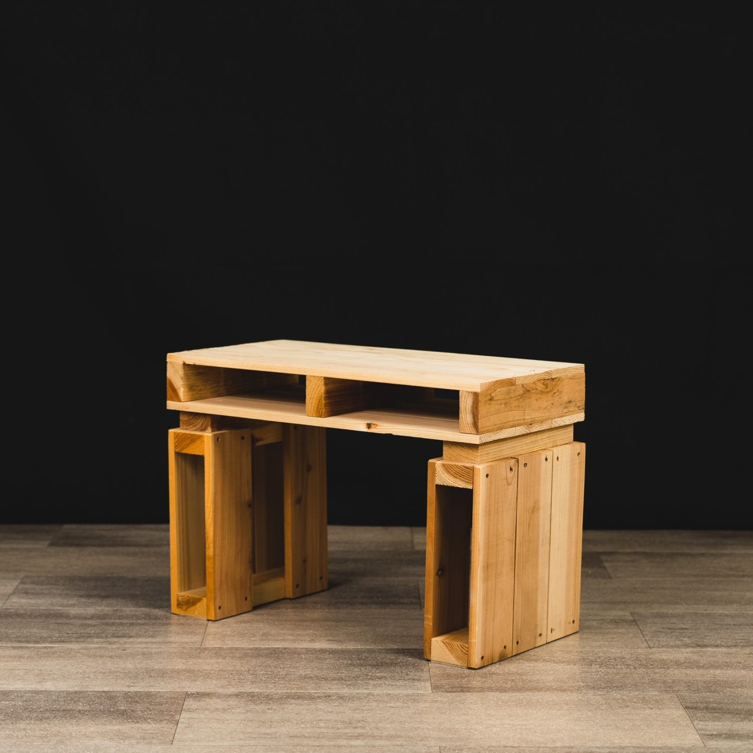 アイデア次第で、テーブルや椅子、棚など無限に応用できるパレット。マルパのオンラインストアでは、届いたパーツを自分で組み立てるだけで完成するパッケージ商品も販売しています。
