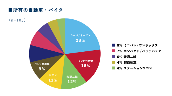 ラグジュアリーカーが最多。SUV/4WD、大型二輪がつづく