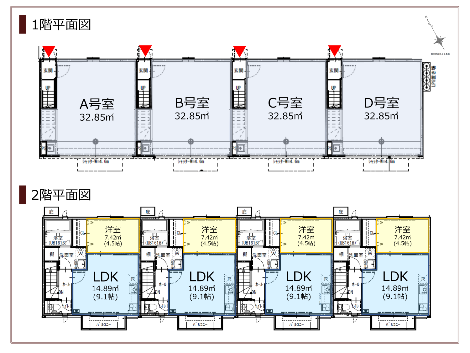 A・D号室 5.0m×2.3m / B・C号室 4.8m×2.0m