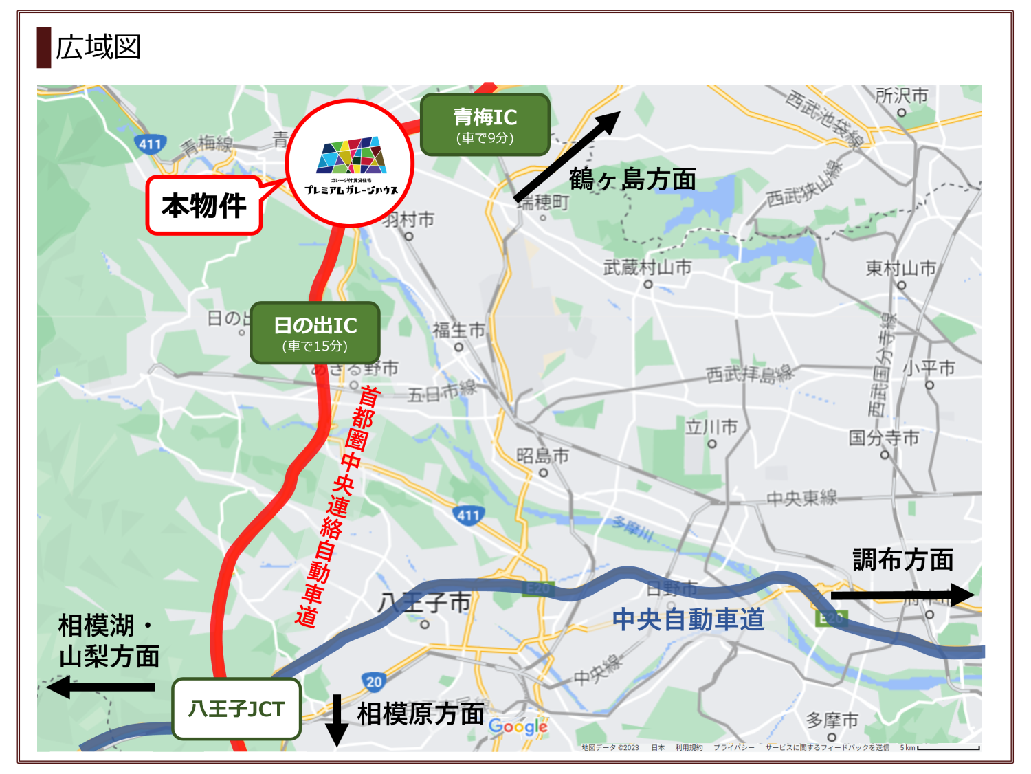 首都圏中央連絡自動車道「日の出IC」入口まで6.9km(車で15分)