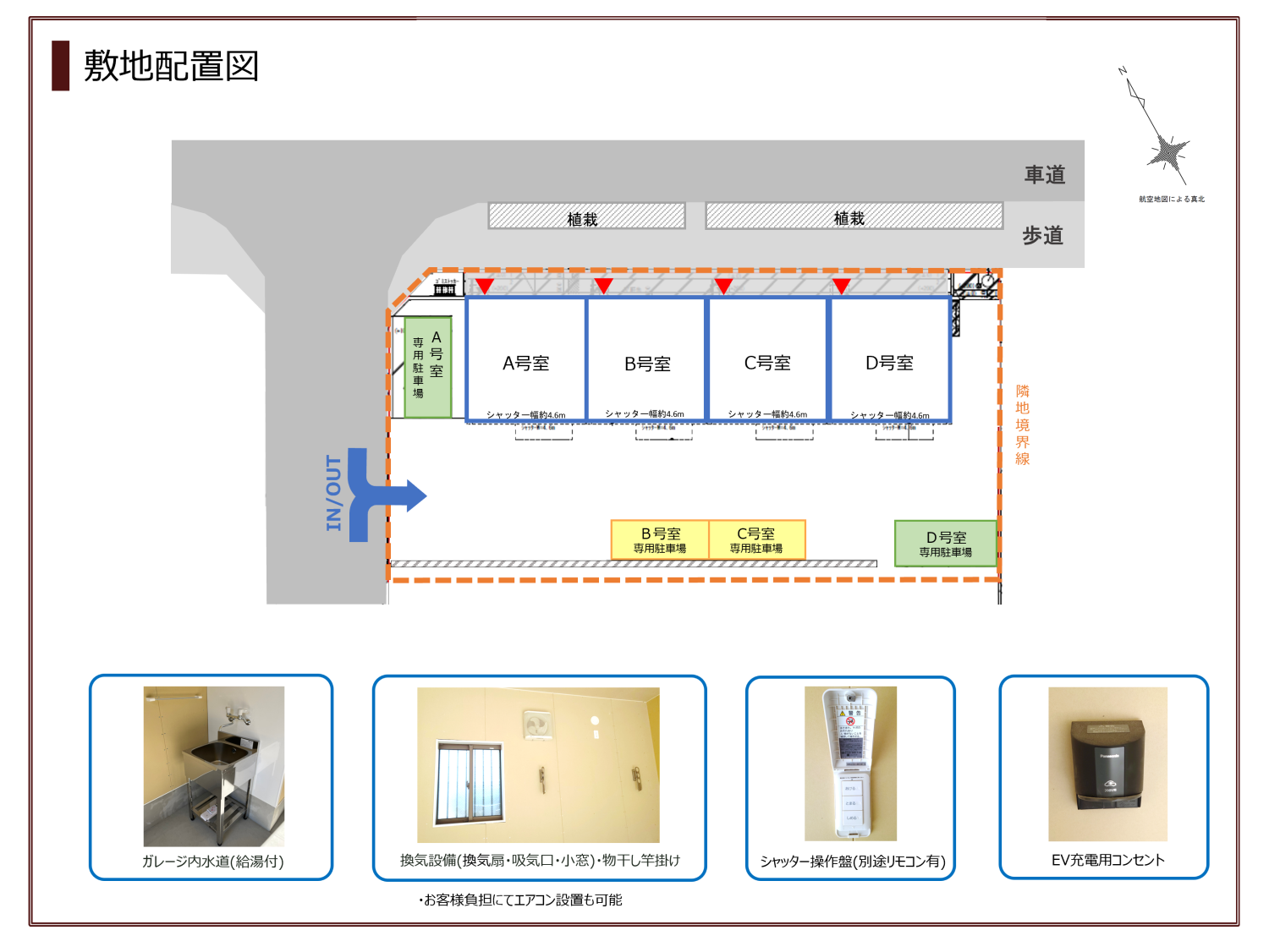 電動シャッターリモコン、コンセント、EV充電用コンセント、ガレージ内水道(給湯付)