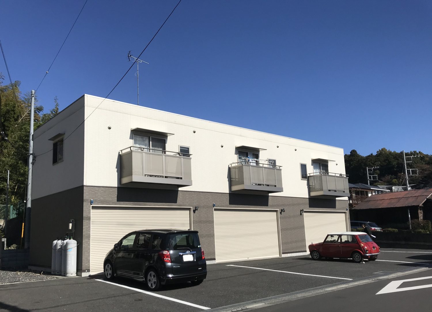 車2台分収容可能ガレージ+1Rの居住スペース+屋外専用駐車場(車2台分)