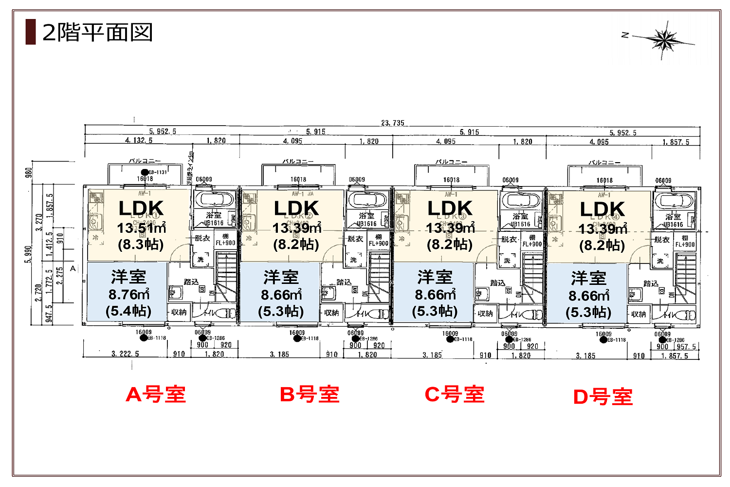 B~D号室:LDK8.2帖、クローゼット付洋室5.3帖