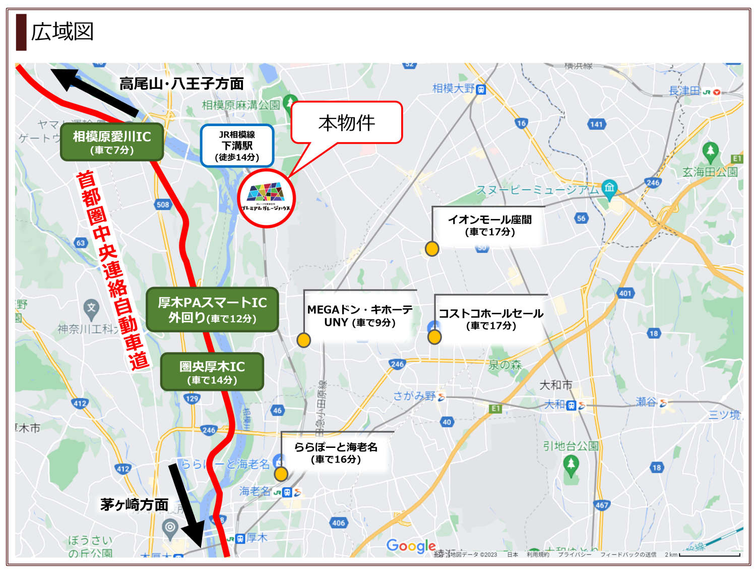 首都圏中央連絡自動車道「相模原愛川IC」入口まで3.2㎞(車で7分)、「厚木PAスマートIC」外回り入口まで5.0㎞(車で12分)、「圏央厚木IC」入口まで6.1㎞(車で14分)