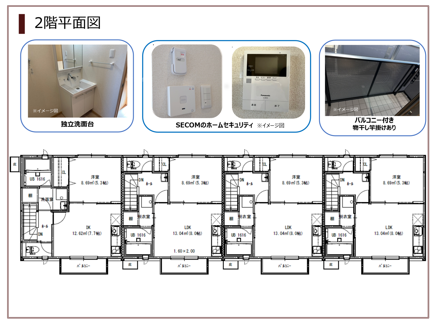 - LDK8.0帖、クローゼット付き洋室5.0帖 、ユニットバス(追焚き機能付・1616サイズ)、洗面化粧台、トイレ(温水洗浄便座付)、システムキッチン
