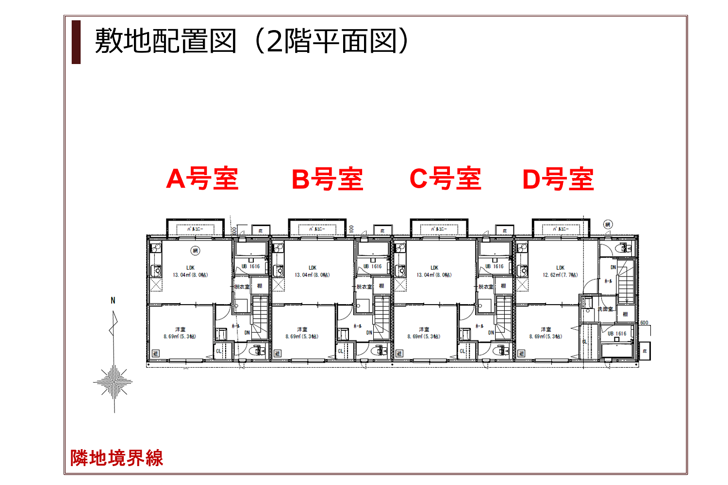- A~C号室:LDK約8.0帖/D号室:DK約7.7帖 洋室約5.3帖(クローゼット付き)