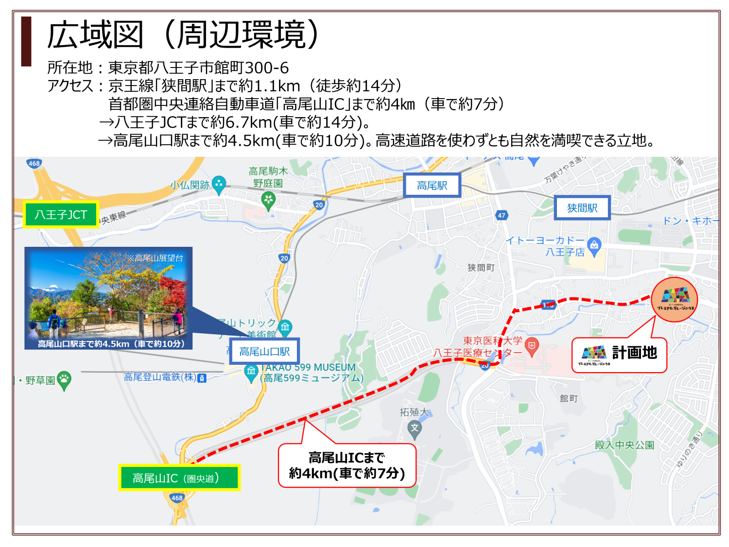 首都圏中央連絡自動車道「高尾山IC」まで約4㎞(車で約7分)