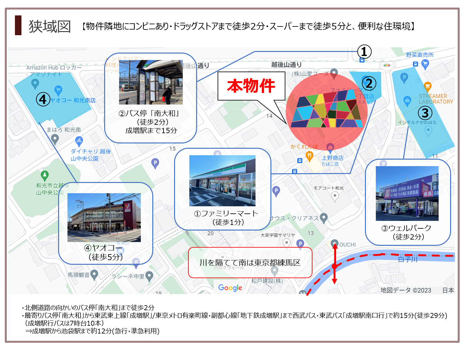 ・徒歩2分のバス停から東武東上線「成増駅」へバスで約15分、成増駅から池袋駅まで約12分(急行・準急利用)