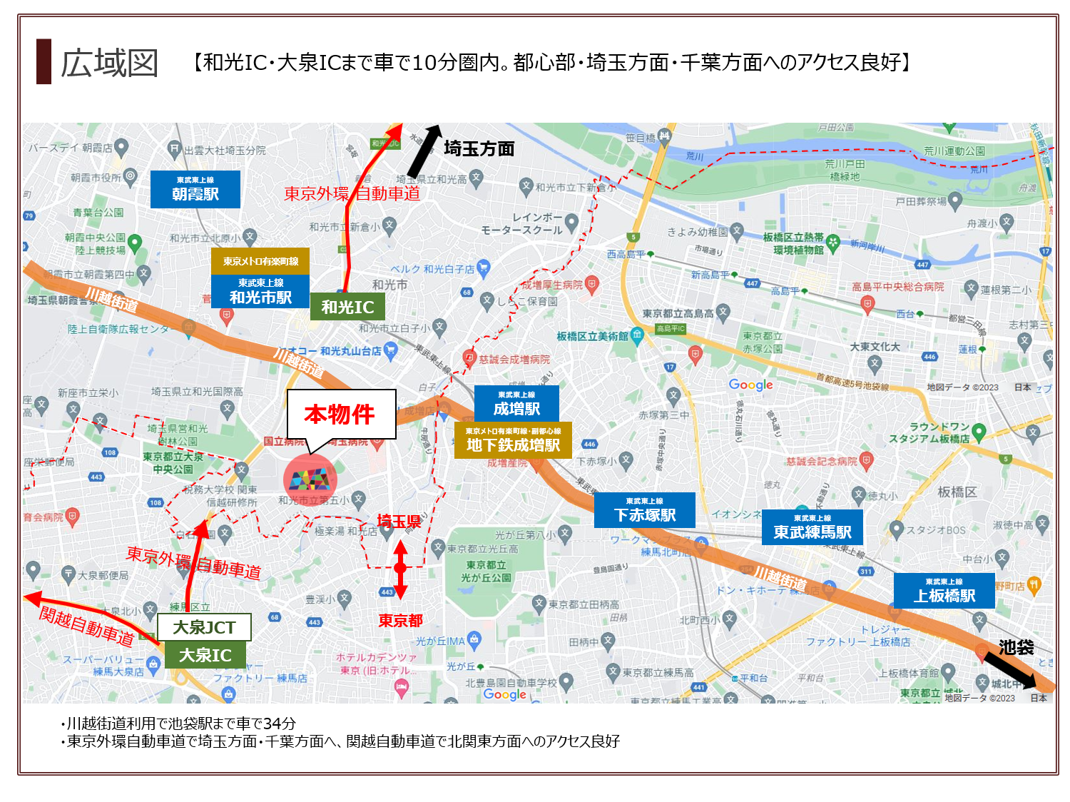 ・和光IC・大泉ICまで車で10分圏内。都心部・埼玉方面・千葉方面へのアクセス良好