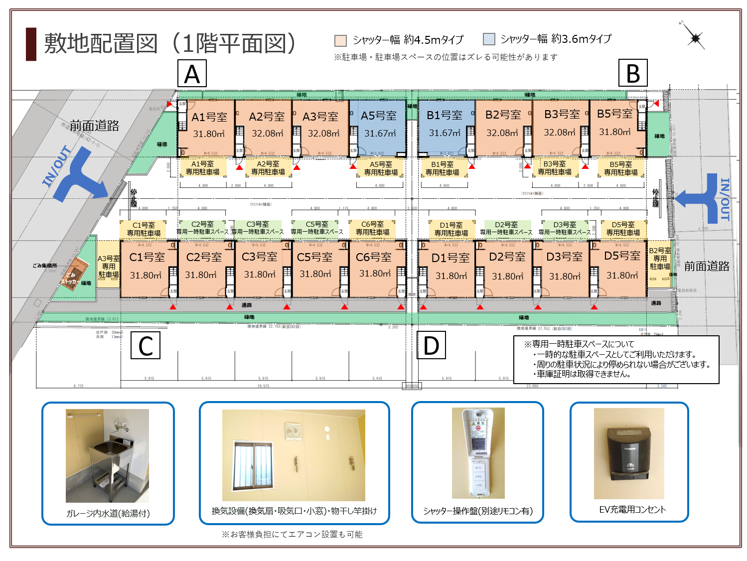 車2台分収容可能ガレージ+1LDK の居住スペース+屋外専用駐車場(車1台分)or屋外専用一時駐車スペース(車1台分) ※C2・C3・C5・D2・D3号室のみ屋外専用一時駐車スペース