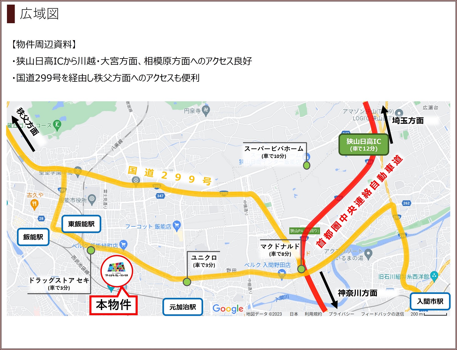 首都圏中央連絡自動車道「狭山日高IC」入口まで5.6km(車で12分)